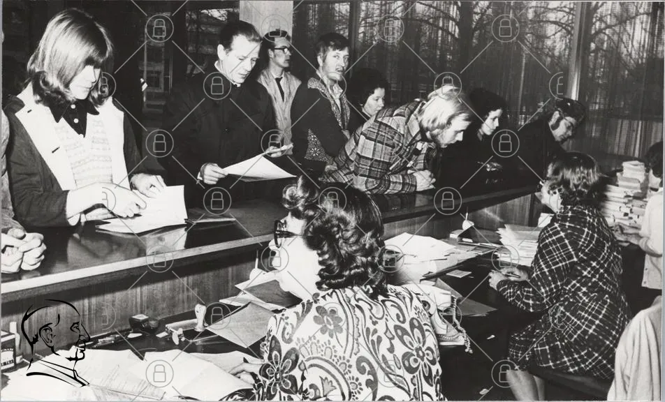 kö, människor, kontor, papper, skrivbord, dokument, väntan, inomhus, glasvägg, administration, arbete, svartvitt, 1970-tal, kläder, kommunikation, interaktion, tjänsteman, ansökan, formulär, stämplar