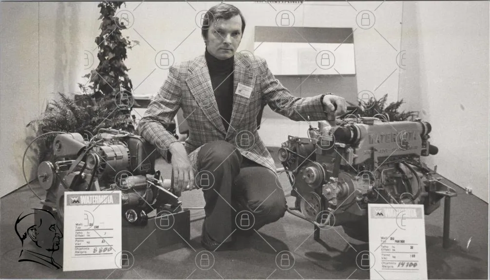 man, motorer, teknik, mässa, 1970-tal, kläder, kostym, maskiner, industri, utställning, svartvitt, motor, ingenjör, presentation, innovation, fordon, mekanik, detaljer, design, arbete, professionell