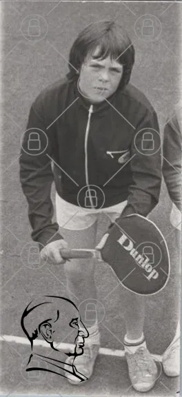 sport, tennis, racket, spelare, träning, svart, vit, kläder, Dunlop, hand, boll, utomhus, aktivitet, motion, tävling, 1970-tal, retro, ungdom, sportutrustning, koncentration, samarbete, vänskap, leende, prestation, energi, passion, hobby, fritid, idrott, gemenskap