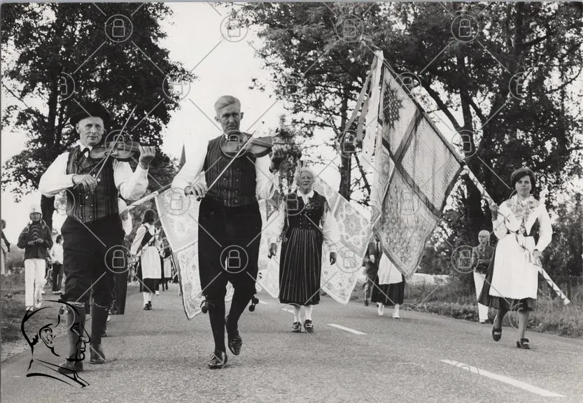 parad, folkmusik, fiol, traditionell, kläder, fest, människor, banderoller, svartvitt, kultur, dans, landskap, väg, samling, historisk, musik, folkdräkt, festligheter, gemenskap, uppträdande