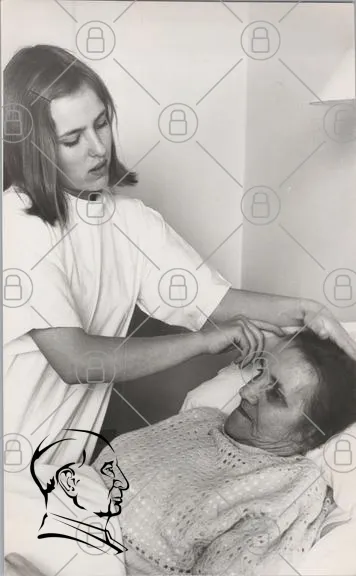 sjuksköterska, äldre kvinna, vård, omsorg, hälsa, medicin, stöd, interaktion, empati, svartvitt, sjukhus, behandling, ansikte, händer, kläder, säng, rum, vårdmiljö, åldrande, mänsklig kontakt