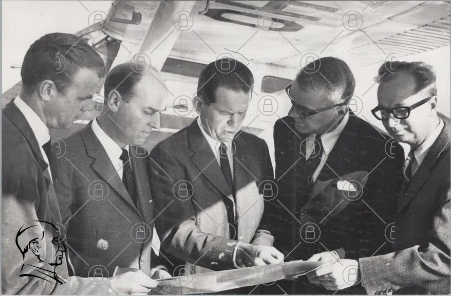 män, kostymer, dokument, flygplan, planering, möte, 1960-tal, affärsmän, teknik, kartor, diskussion, svartvitt, professionellt, samarbete, detaljer, presentation, industri, historia, företagande, ledarskap