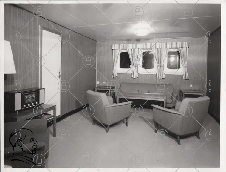 rum, inredning, möbler, soffa, fåtöljer, fönster, gardiner, radio, väggar, golv, belysning, svartvitt, retro, stil, hem, komfort, sittgrupp, dekoration, interiör, 1900-tal