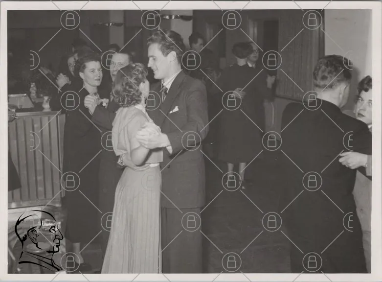 dans, fest, 1940-tal, klänning, kostym, par, socialt, glädje, musik, dansgolv, svartvitt, retro, elegans, festligheter, människor, samvaro