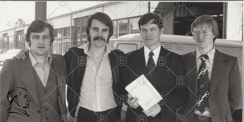 svartvitt, foto, män, mustasch, kostym, skjorta, 1970-tal, retro, dokument, byggnad, utomhus, stil, kläder, ansikten, grupp, porträtt, historia, nostalgi, professionell, samarbete