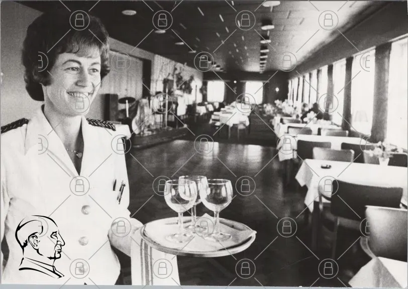 kvinna, servitris, servera, glas, bricka, restaurang, inredning, svartvit, leende, kläder, bord, stolar, fönster, mat, dryck, professionell, personal, atmosfär, 1980-tal, interiör, service, traditionell, elegant, stil, upplevelse, gäster, miljö, vänlighet, arbete, yrke