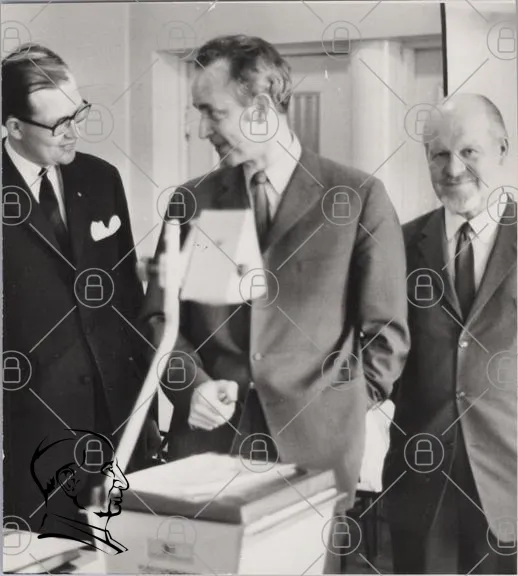 svartvitt, foto, män, kostymer, glasögon, leende, kontor, teknik, utrustning, 1960-tal, professionell, samarbete, presentation, forskning, medicin, historia, vetenskap, innovation, möte, diskussion