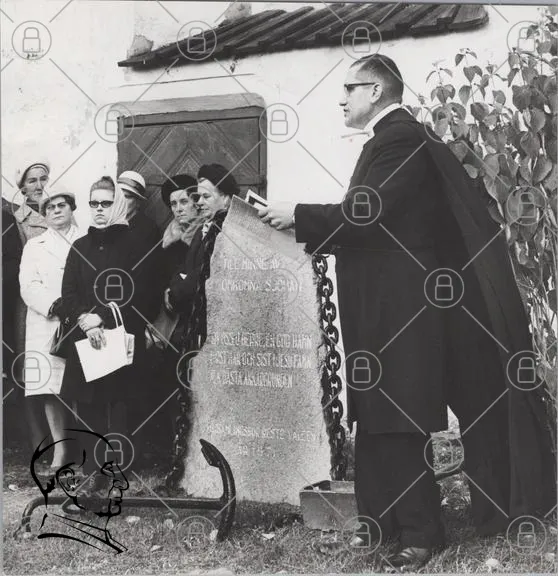 präst, tal, minnessten, kedja, ankare, människor, utomhus, ceremoni, kläder, glasögon, hattar, byggnad, buskar, svartvitt, grupp, text, sten, historisk, samling, tradition