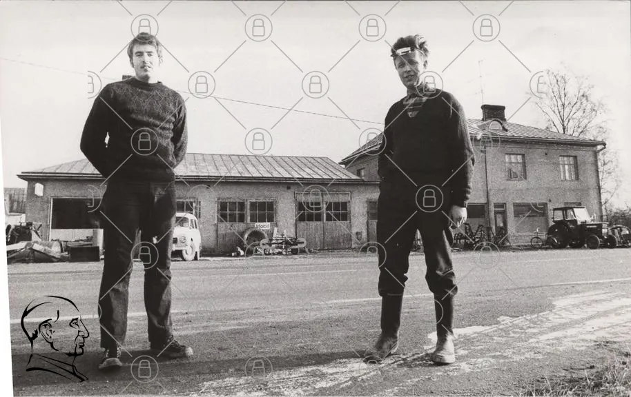 två män, svartvitt, byggnader, landskap, 1960-tal, kläder, gator, fordon, industri, ungdomar, porträtt, utomhus, stil, historisk, fotografi, Sverige, landsbygd, kultur, tradition, samhälle, vänner