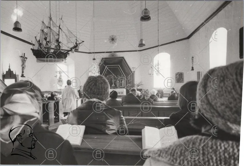 kyrka, gudstjänst, människor, bänkar, predikant, båtmodell, inredning, svartvitt, andakt, böcker, ljuskronor, väggar, fönster, kläder, tradition, samling, gemenskap, tro, religiös, kultur