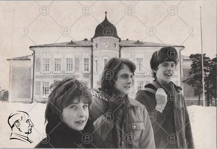 snö, ungdomar, vinter, byggnad, svartvitt, kläder, leende, pojkar, flickor, skola, 1970-tal, friluftsliv, gemenskap, fotografi, historiskt, retro, kallt, ansikten, vänskap, minnen