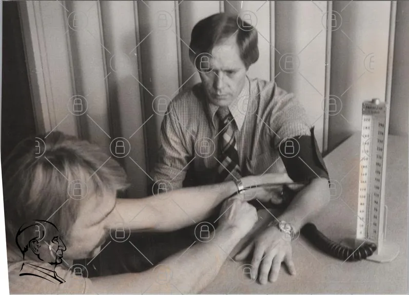 läkare, patient, blodtryck, mätning, medicinsk, kontor, 1970-tal, man, skjorta, slips, arm, hälsa, vård, professionell, svartvitt, medicinsk utrustning, medicinsk personal, konsultation, kroppslig undersökning, medicinsk historia, sjukvård, diagnos, medicinska procedurer, medicinsk övervakning, professionell miljö, medicinsk rådgivning, medicinsk praktik, hälsokontroll, medicinsk bedömning, medicinsk hjälp