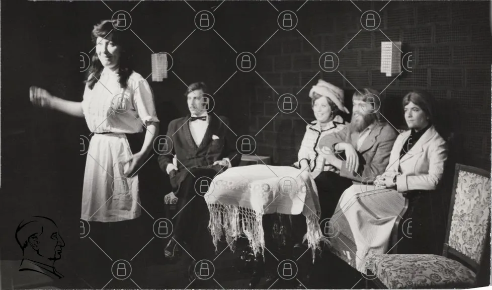 teater, skådespelare, svartvitt, kostymer, 1900-tal, scen, publik, drama, kläder, bord, stolar, kvinna, man, hatt, skägg, föreställning, uttryck, rekvisita, vintage, grupp, interaktion, sittande, stående, karaktärer, teaterkonst, underhållning, traditionell, kostymdrama, scenografi, rollspel