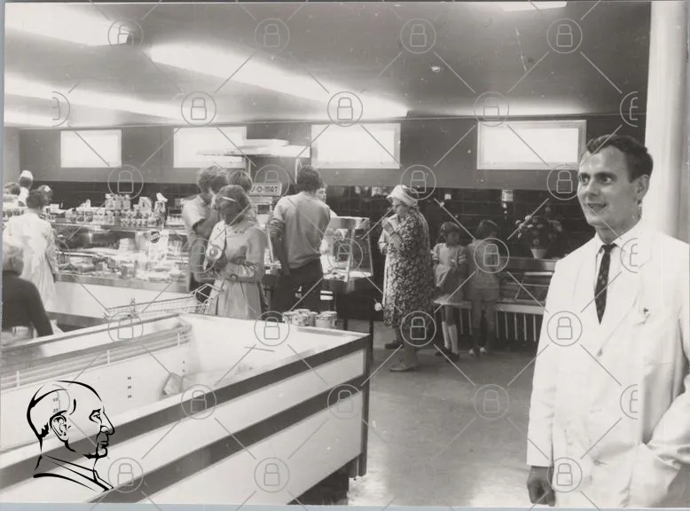 affär, butik, människor, 1960-tal, kläder, mat, frys, glass, personal, kunder, retro, svartvitt, inredning, familj, shopping, livsmedel, disk, varor, service, leenden, barn