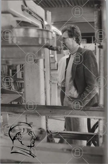 man, glasögon, grå kostym, verkstad, maskiner, industri, svartvitt, teknik, arbete, forskning, laboratoriemiljö, män, stående, observation, detaljer, professionell, miljö, experiment, ingenjör, diskussion, fokus, kreativitet, innovation, design, analys, utrustning, verktyg, process, samarbete, utbildning
