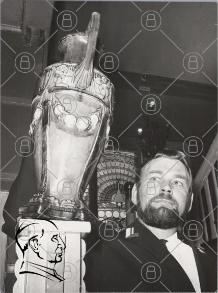 trophy, man, beard, black and white, vintage, award, celebration, stairs, uniform, historical, achievement, ceremony, sports, holding, expression, decoration, interior, design, glass, metal, portrait, event, recognition, tradition, culture, pride, success, symbol, honor, legacy