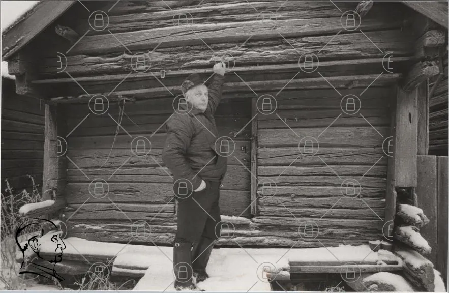 man, gammal, stuga, trä, snö, vinter, kläder, svartvit, landskap, traditionell, byggnad, dörr, fönster, natur, kultur, historia, jordbruk, rural, ensam, utomhus, fotografi, gammal, hantverk, rustik, stil, människa, landsbygd, gammal, tidlös