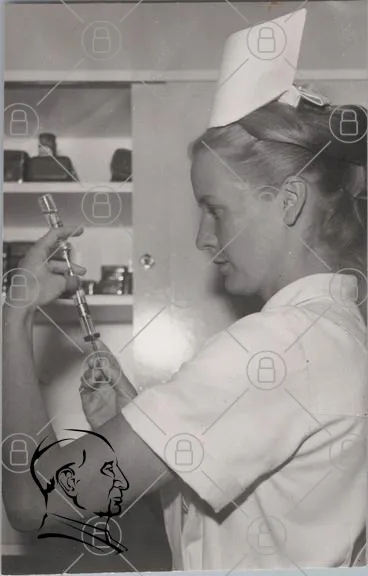 sjuksköterska, spruta, medicin, vård, hälsa, 1950-tal, svartvitt, sjukvård, injektion, professionell, kvinna, arbetskläder, sjukhus, medicinsk utrustning, vårdmiljö, historia, medicinsk personal, steril, noggrannhet, patientvård, medicinsk praktik