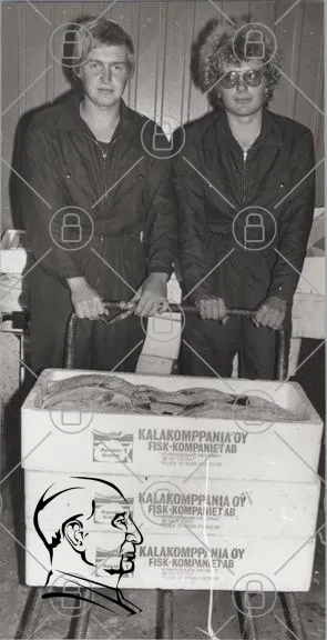 fisk, män, KALAKOMPANNA OY, FISK-KOMPANI AB, svartvitt, fiske, korg, arbete, industri, 1900-tal, kläder, handtag, fiskeprodukter, tradition, hav, fiskeindustri, män i arbetskläder, fiskeutrustning, historisk, samarbete, fiskeaffär, lokal, företag, skaldjur, fångst, fiskehistorik, arbetsmiljö, teamwork, fiskehandlare, fiskeverksamhet