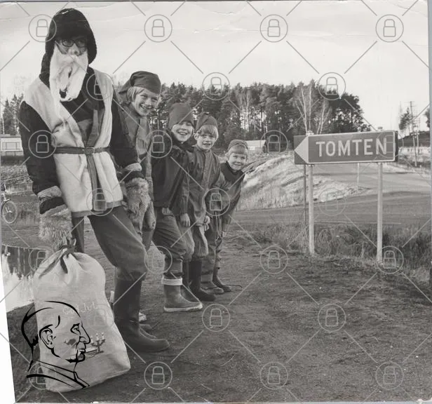 tomten, barn, jul, svartvitt, säck, god jul, vinter, landskap, skylt, tradition, kostym, leende, hattar, gummistövlar, snö, familj, fest, glädje, natur, gammaldags, fotografering, samling, barnkläder, skog, väg, gemenskap, lekfullhet, minnen, kultur