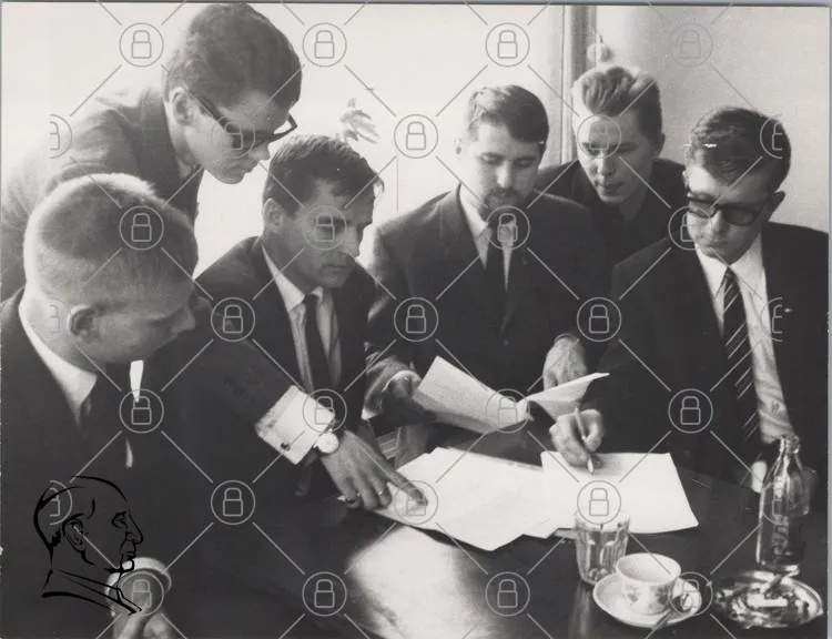 svartvit, möte, dokument, män, kostymer, skrivbord, papper, kaffe, glas, 1960-tal, affärsmän, diskussion, kontor, formell, samarbete, presentation, grupp, professionell, historisk, interaktion