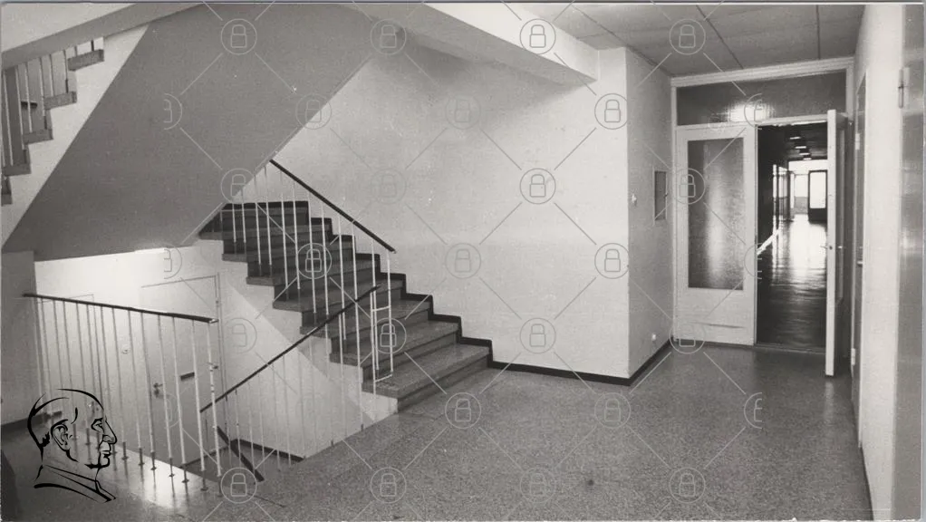 trappa, inomhus, byggnad, väggar, golv, räcke, dörr, belysning, modern, minimalistisk, svartvitt, arkitektur, design, utrymme, steg, entré, kontor, offentlig, interiör, stil, funktionell, enkel, ren, ljus, skugga, linjer, perspektiv, rum, struktur, material