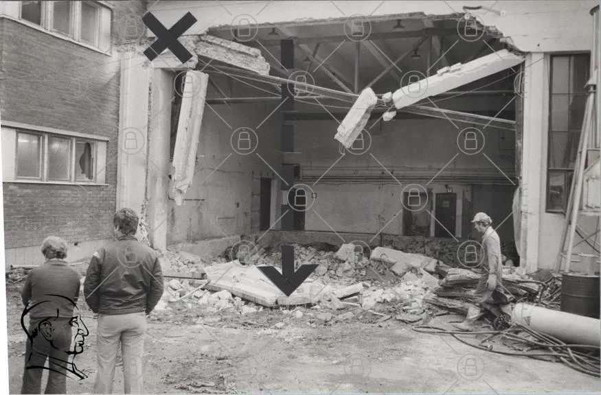 byggarbetsplats, rivning, betong, konstruktion, män, arbete, maskiner, skräp, industri, inomhus, säkerhet, byggmaterial, ruiner, 1970-tal, renovering, byggnadsarbetare, stål, tak, väggar, golv, avfall, arbetskläder, projekt, byggnadsplats, arbete i grupp, byggnadsverk, rivningsarbete, byggnadsinspektion, byggnadsplan, byggnadsdesign, byggnadsarbete