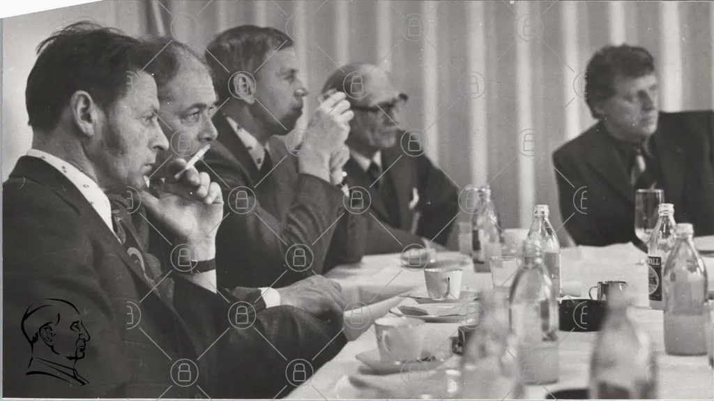 svartvitt, män, möte, kaffe, cigarett, diskussion, 1960-tal, kläder, bord, koppar, glas, allvarliga, ansikten, inomhus, retro, vintage, konferens, samtal, uttryck, grupp, stil, traditionell, interaktion, socialt, miljö, dokumentation, historisk, samling, fokus, detaljer