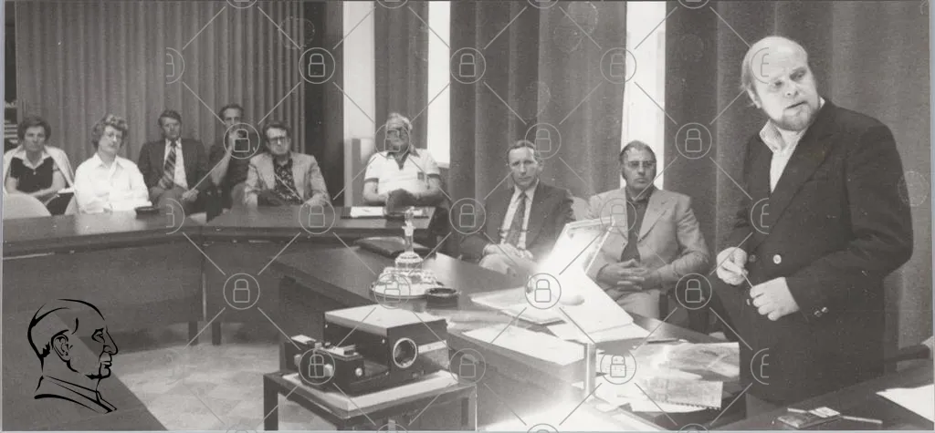 möte, män, kontor, 1970-tal, svartvitt, diskussion, bord, glas, projektor, kläder, slips, stolar, fönster, gardiner, dokument, skrivbord, affärsmän, professionell, samarbete, presentation, grupp, inomhus, formell, äldre, traditionell, ledarskap, kommunikation, företagande