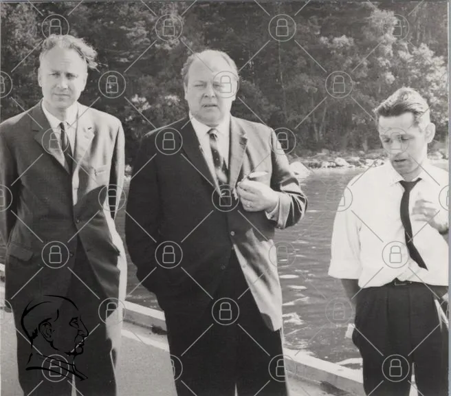 svartvitt, män, kostymer, sjö, träd, 1960-tal, porträtt, grupp, affärsmän, utomhus, formell, kläder, fotografi, historisk, stil, ansiktsuttryck, samarbete, professionell, landskap, natur