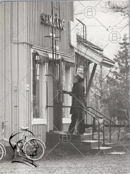 butik, kvinna, cykel, trappa, dörr, fönster, skylt, gammal, svartvit, landsbygd, kläder, vinter, träd, byggnad, utomhus, handtag, besökare, lokal, samhälle, traditionell, stil, 1900-tal, retro, natur, miljö, fotografering, historia, kultur, vardag