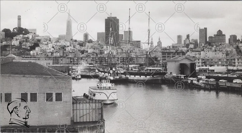 San Francisco, hamn, segelbåtar, stadssilhuett, byggnader, vatten, svartvit, båtar, skyline, moln, historisk, marina, broar, turism, kultur, arkitektur, landskap, transport, sjöfart, stadsliv, vy