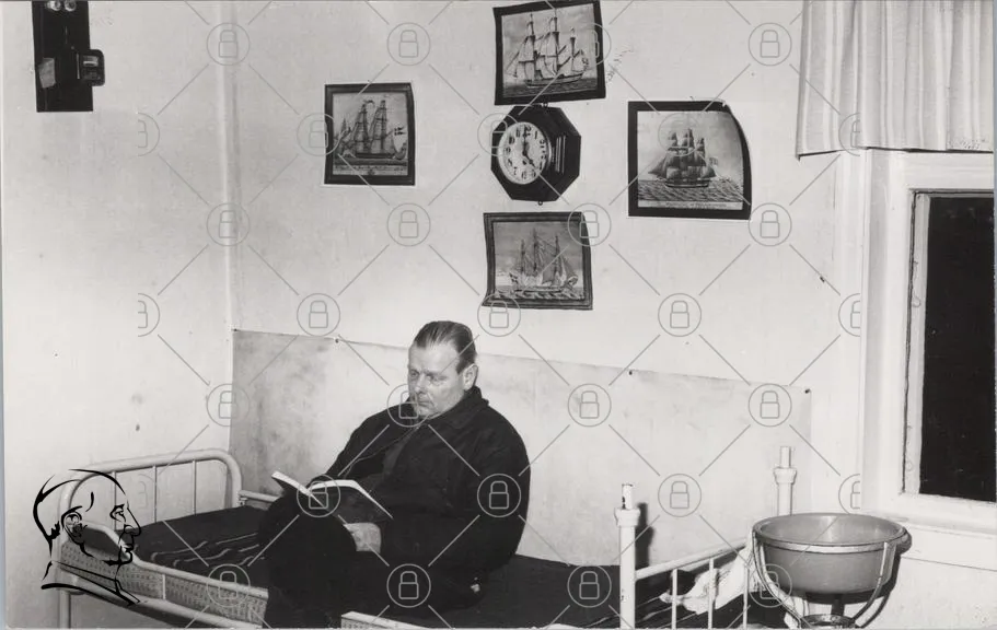 man, läsande, bok, säng, klocka, väggkonst, segelbåtar, svartvitt, inomhus, rum, möbler, sängkläder, avslappnad, ensam, 1900-tal, interiör, hemtrevlig, nostalgisk, stillsam, kultur