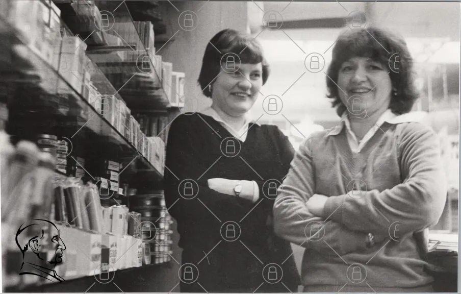 två kvinnor, leende, butik, hyllor, produkter, svartvitt, retro, vänskap, 1980-tal, kläder, interiör, kund, försäljning, skratt, ansikten, närbild, nostalgisk, affär, varor, samspel, socialt, atmosfär, glädje, minnen, gemenskap, leenden, interaktion, vardag, livsstil