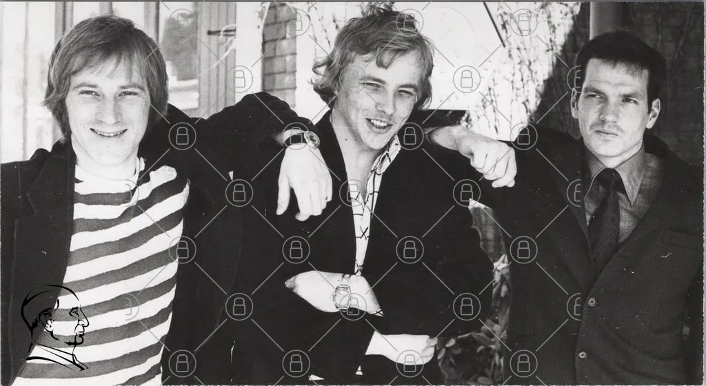 svartvit, foto, män, leende, kläder, 1970-tal, stil, grupp, vänner, armkrok, klocka, frisyr, bakgrund, byggnad, porträtt, casual, uttryck, nostalgi, ungdom, samhörighet, skratt, minnen, socialt, avslappnat, fotografi