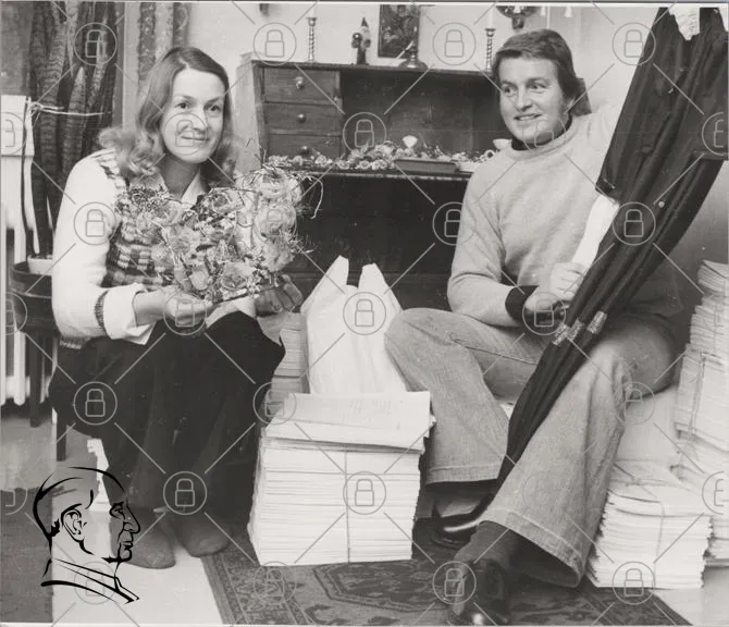 1970-tal, svartvitt, inomhus, två personer, blommor, dekoration, möbler, paraply, papper, stil, retro, interiör, leende, kläder, hem, konst, arrangemang, textilier, bord, korg, vänskap