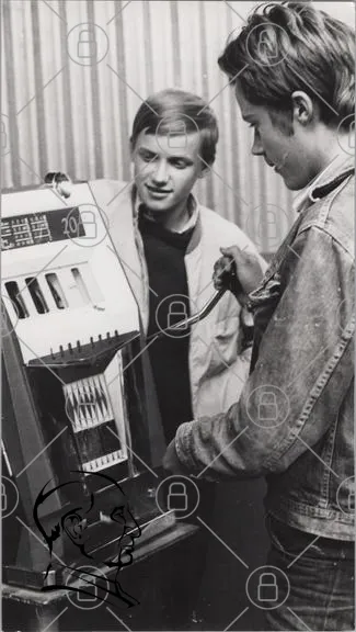 två killar, spelautomat, svartvitt, retro, 1980-tal, underhållning, ungdomar, maskin, nöje, vintage, kläder, leende, socialt, interaktion, teknik, nostalgi, spel, pengar, kort, vänskap, ungdomskultur, 20, jackpot, spelande, avslappnat, casual, bakgrund, metall, stående, inomhus
