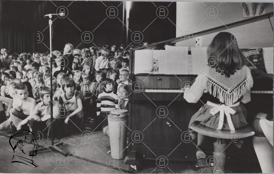 barn, publik, piano, konsert, sång, uppträdande, mikrofon, trummor, kläder, 1970-tal, svartvitt, musik, skola, barnprogram, scen, underhållning, barnkör, instrument, föreställning, samling, leende, koncentration, traditionell, kultur, barnaktiviteter, gemenskap, glädje, ungdomar, skådespelare, artist