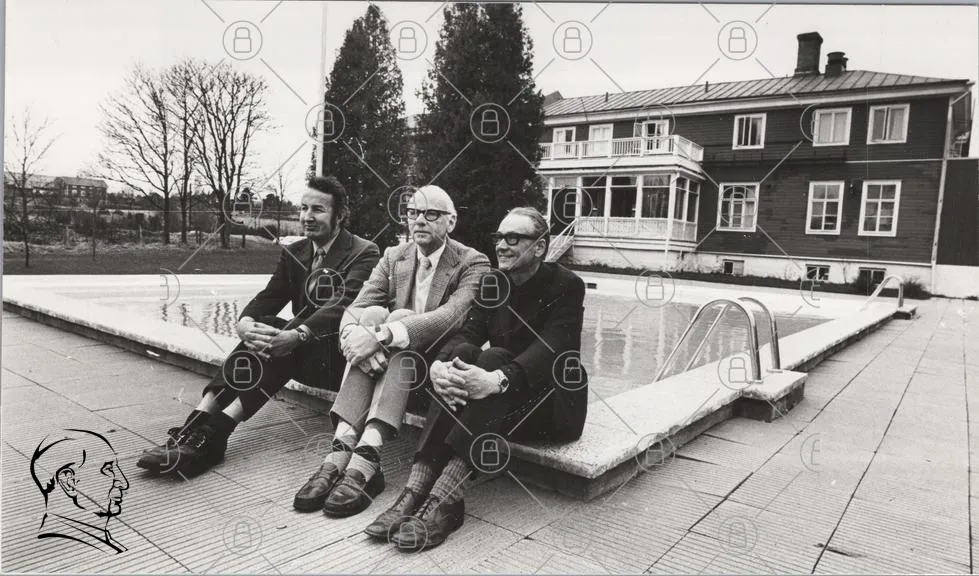 svartvit, män, sittande, pool, träd, byggnad, kostymer, glasögon, stil, 1960-tal, utomhus, vänner, avslappnad, mode, fotografi, retro, arkitektur, sällskap, skratt, socialt, tidsepok, kläder, interaktion, landskap, miljö, nostalgi, samarbete, kultur, historia
