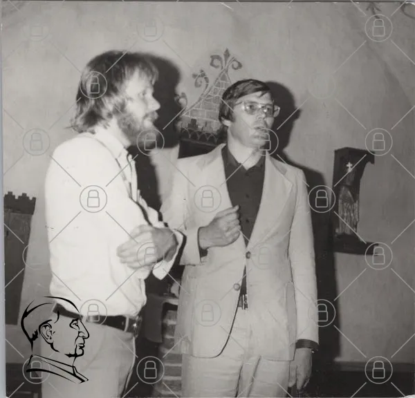 svartvitt, foto, män, kläder, kostymer, skägg, glasögon, inomhus, 1970-tal, diskussion, interaktion, bakgrund, vägg, konst, stil, vintage, nostalgi, uttryck, ansiktsuttryck, kroppsspråk, socialt, samspel, historiskt, porträtt, grupp, kultur, tidsepok, miljö, rum