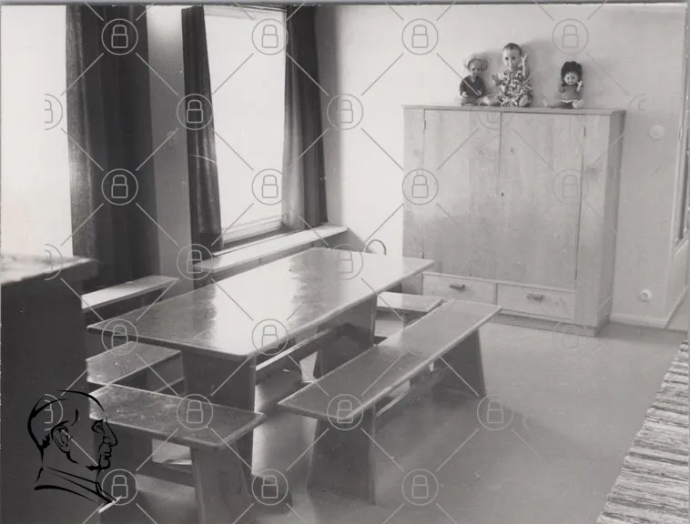 rum, bord, bänkar, fönster, gardiner, dockor, skåp, trä, inredning, svartvit, möbler, golv, väggar, ljus, heminredning, retro, minimalistisk, barnrum, lekrum, stil, vintage, hem, familj, utrymme, komfort, design, dekoration, atmosfär, enkelhet, funktionalitet