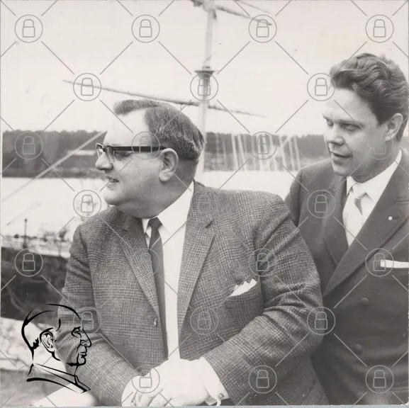 två män, kostymer, slipsar, glasögon, fartyg, segelbåt, utomhus, svartvitt foto, 1960-tal, formellt klädda, konversation, hav, träd, bakgrund, historisk bild, klassisk stil