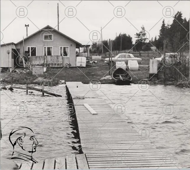 hus, brygga, vatten, båt, bil, träd, landskap, sommar, natur, sjö, byggnad, strand, gammal, svartvit, fritidshus, kaj, lugn, stillhet, rekreation, utomhus, landsbygd