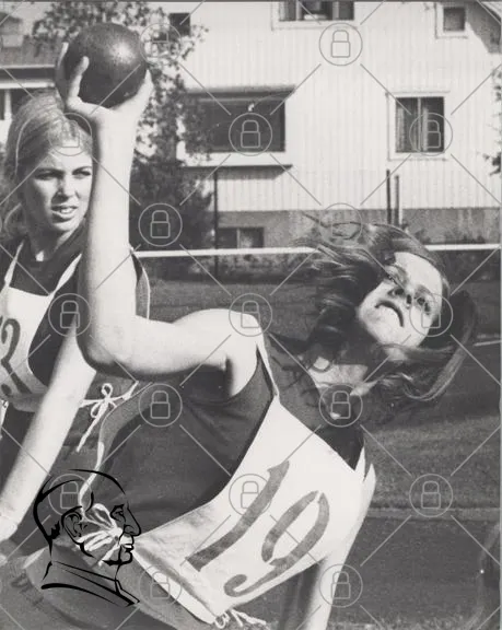 kast, sport, tävling, ungdomar, tjejer, nummer 10, nummer 23, atletik, retro, svartvitt, utomhus, motion, fokus, prestation, laganda, gymnasiet, idrott, kastgren, frisyr, kläder, nummertröjor, aktivitet, energi, ungdomsidrott, träning, tävlingsanda, historisk, sportevenemang, ungdomstävling