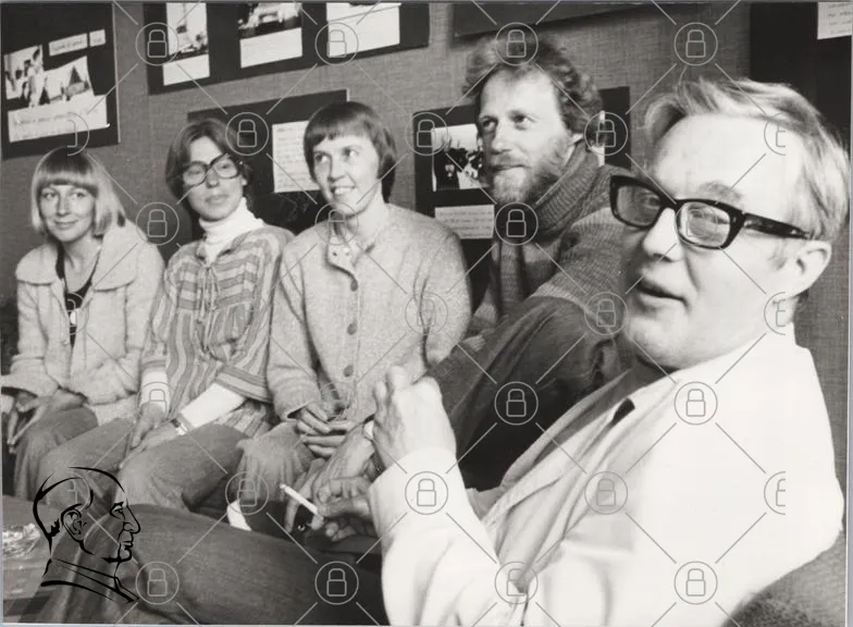 svartvitt, grupp, människor, 1970-tal, inomhus, samtal, kläder, glasögon, leenden, fotografi, retro, kultur, konst, uttryck, socialt, samarbete, kreativitet, historia, nostalgi, interaktion, vänskap, avslappnad, miljö, dokumentär, minnen, konstnärer, diskussion, uttryck, gemenskap