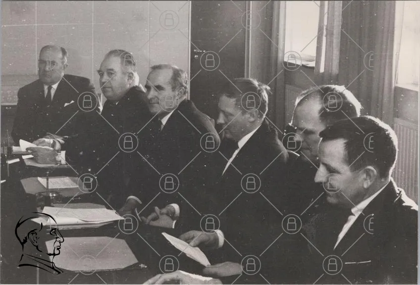 möte, män, svartvitt, bord, dokument, kontor, diskussion, 1900-tal, kläder, ansiktsuttryck, professionell, grupp, ledarskap, historia, formell, samarbete, beslut, kommunikation, traditionell, inomhus