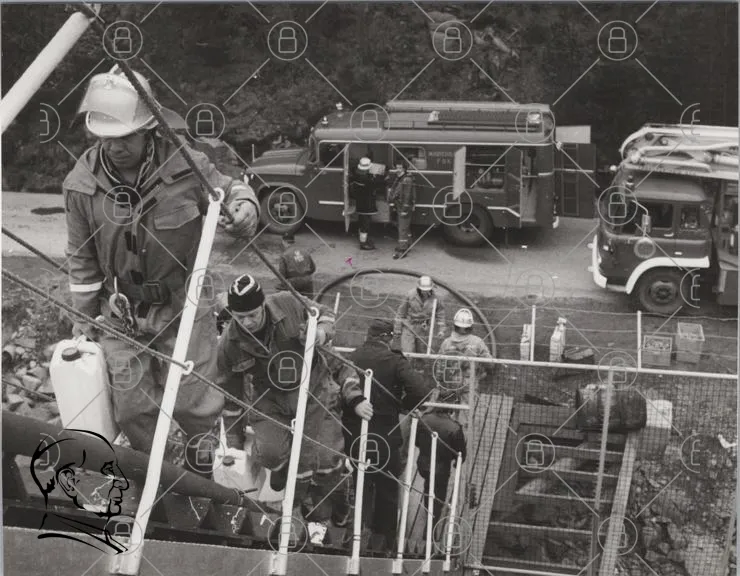 brandmän, räddning, brandbil, klättra, stege, säkerhet, arbete, svartvitt, natur, utrustning, teamwork, insats, berg, räddningsoperation, hjälmar, kläder, professionell, risk, nödsituation, kommunikation, samarbete, miljö, människor, bro, väg, fordon, brandstation, historisk, 1900-tal