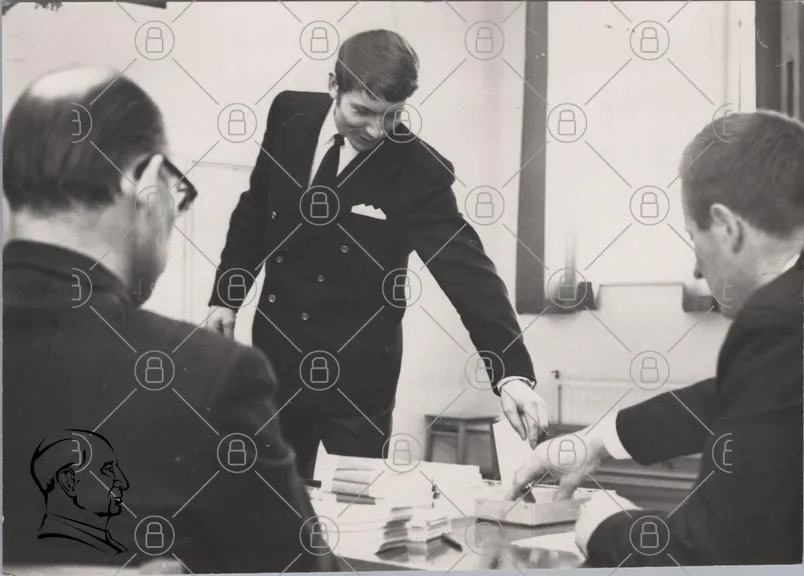 man, kostym, möte, bord, dokument, svartvitt, affärsmän, diskussion, presentation, 1960-tal, kontor, professionell, kläder, ansiktsuttryck, gest, interaktion, skrivbord, papper, anteckningar, stil, formell, samarbete, grupp, fokus, kommunikation, affärsmöte, ledarskap, förhandlingar, arbetsmiljö, traditionell