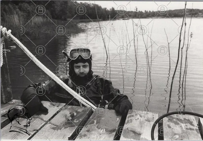 dykare, dykutrustning, sjö, träbrygga, svartvitt, natur, vatten, snorkel, simning, friluftsliv, sport, äventyr, dykning, stilla, landskap, vegetation, man, säkerhet, utrustning, hobby, rekreation