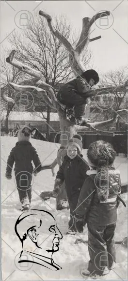 barn, snö, träd, lekplats, vinter, klättra, skratt, vinterkläder, kompisar, utomhus, svartvitt, barndom, lek, natur, glädje, snöfall, barnspel, vänskap, roligt, aktivitet